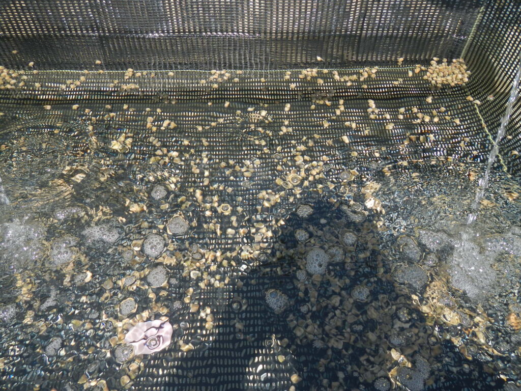 サザエをカゴで飼っていると、サザエが隅に固まってしまい、その間に糞や食べ残しの餌がたまり、環境が悪くなりがちでした。